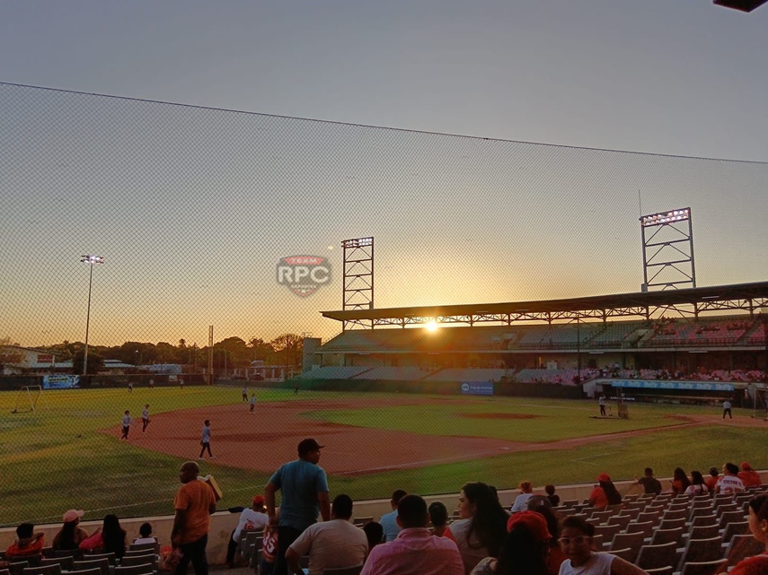 Pocos minutos para el arranque del juego, así con un bello atardecer, calientan los peloteros.
