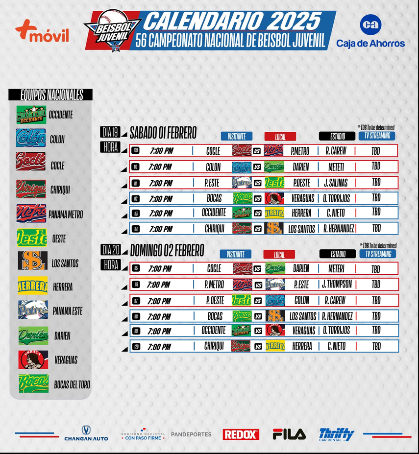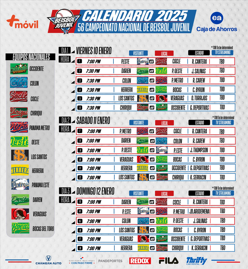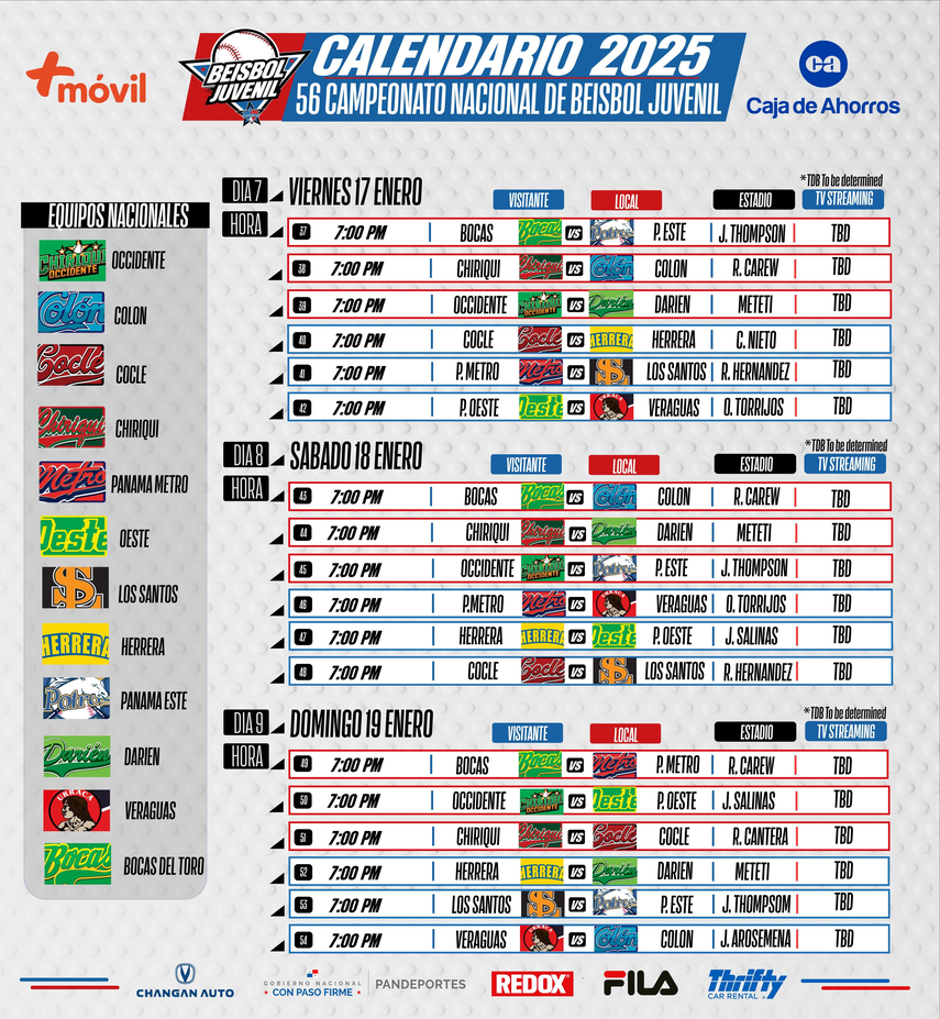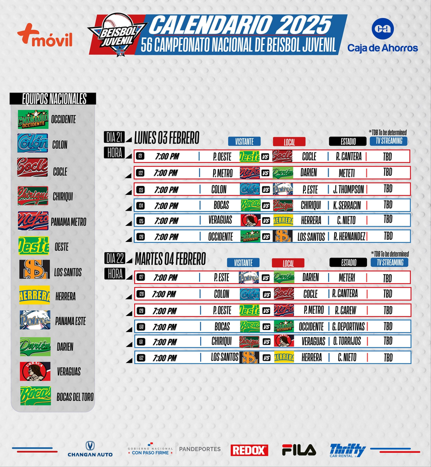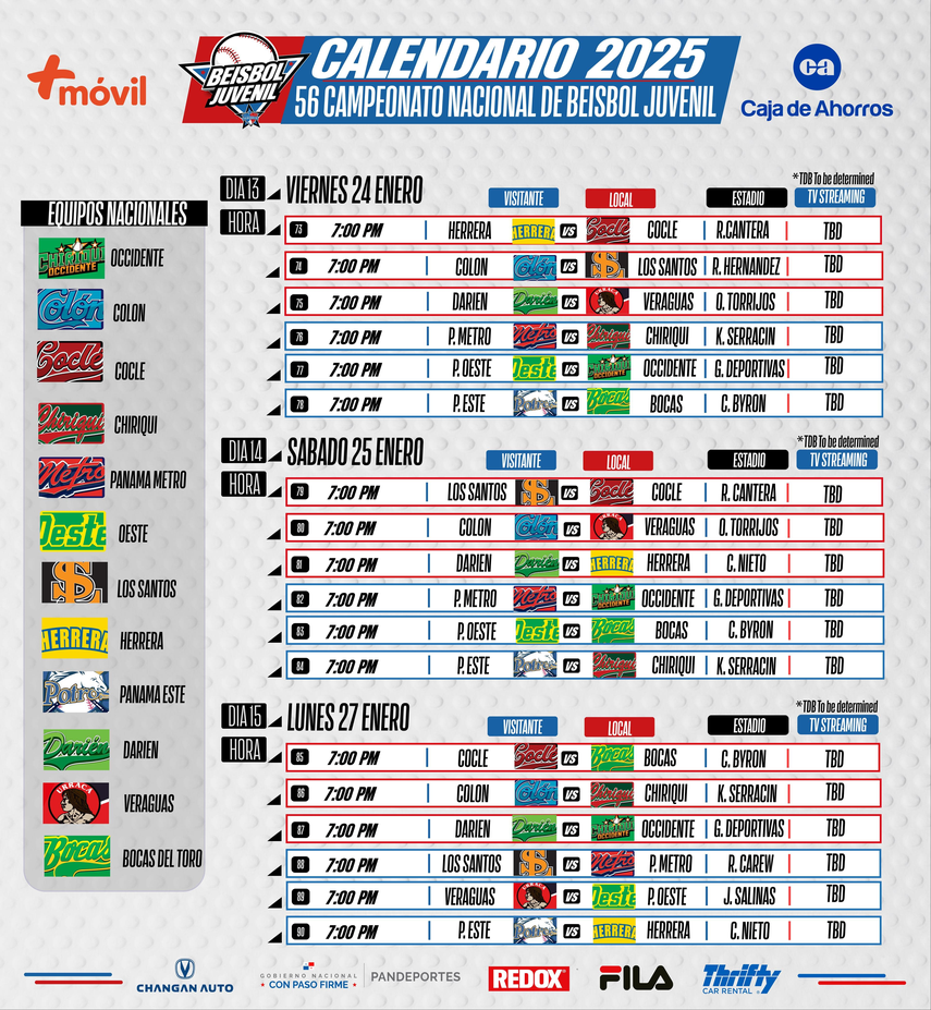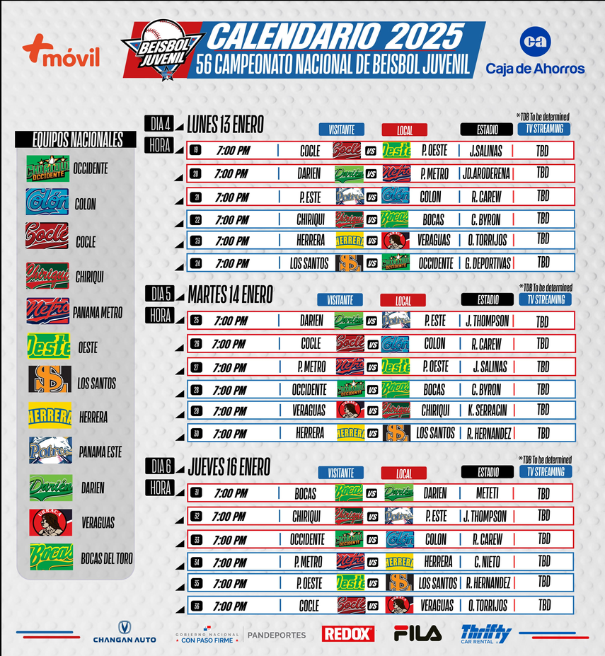 Los Potros de Panamá Este visitan a los campeones de la "Leña Roja" de Coclé en el partido de inauguración del 56 Campeonato Nacional de Béisbol Juvenil 2025, Copa Caja de Ahorros, la noche de este viernes 10 de enero, próximo.