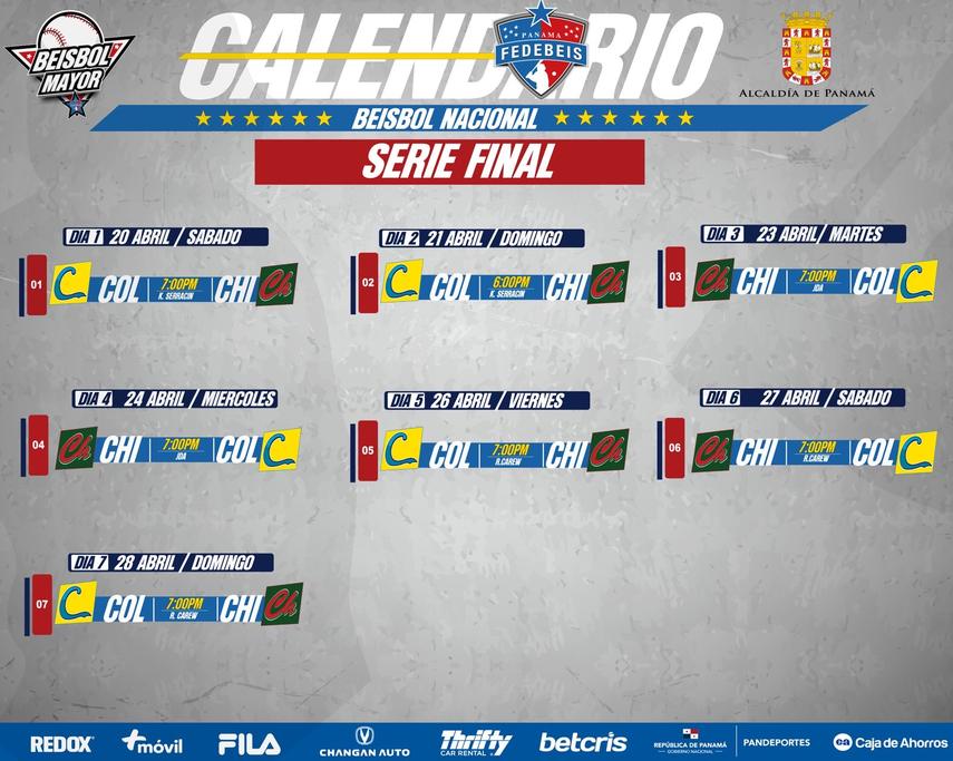 La Federación Panameña de Béisbol (FEDEBEIS) anunció en sus redes sociales el calendario para la serie final del Campeonato Nacional de Béisbol Mayor 2024, Copa Alcaldía de Panamá que se disputará entre Colón y Chiriquí y que arrancará en el estadio Kenny Serracín.