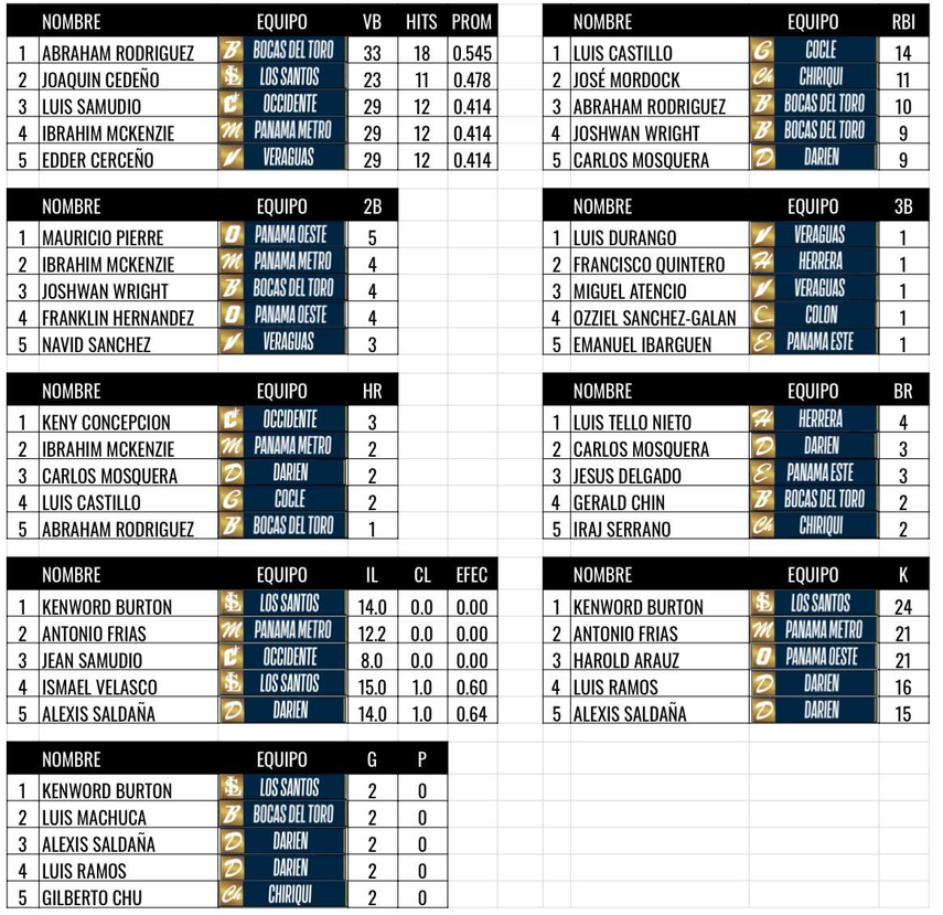 En ponchados el líder es Kenworth Burton con 24, Antonio Frías de Metro con 21 y Harold Araúz de Oeste con 21. En efectividad, Burton también es el líder con 0.00 en 14.0 entradas trabajadas.