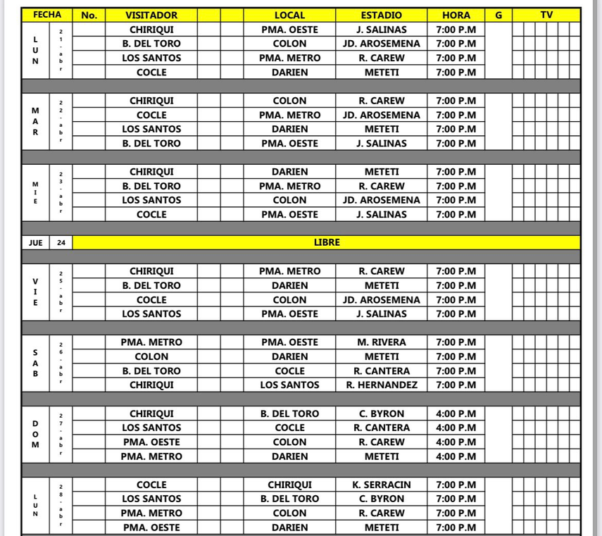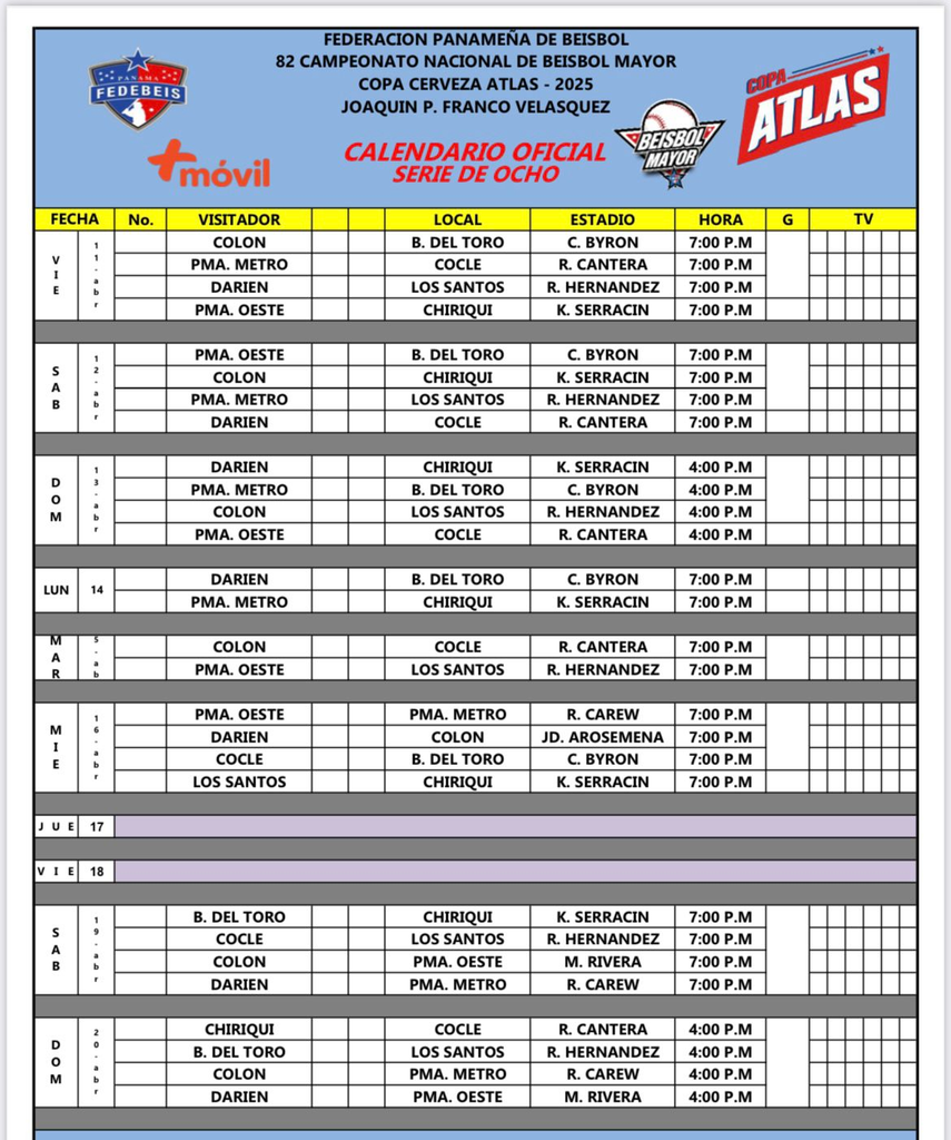 La Federación Panameña de Béisbol (FEDEBEIS) reveló esta tarde el calendario oficial de competencias, para utilizar en la Ronda de Ocho del Béisbol Mayor 2025, donde destacan 4 partidos desde este viernes 11 de abril, todos a las 7:00 p.m.