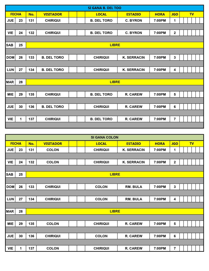 Tomando en cuenta estadio Calvin Byron opción la Serie Final se traslada a David Chiriquí, para juegos los días domingo 26 y lunes 27 de abril y se cierra con tres juegos en el Rod Carew tras el descanso del martes 28 de mayo, jugando miércoles 29 de abril, jueves 30 de abril y viernes 1 de mayo.