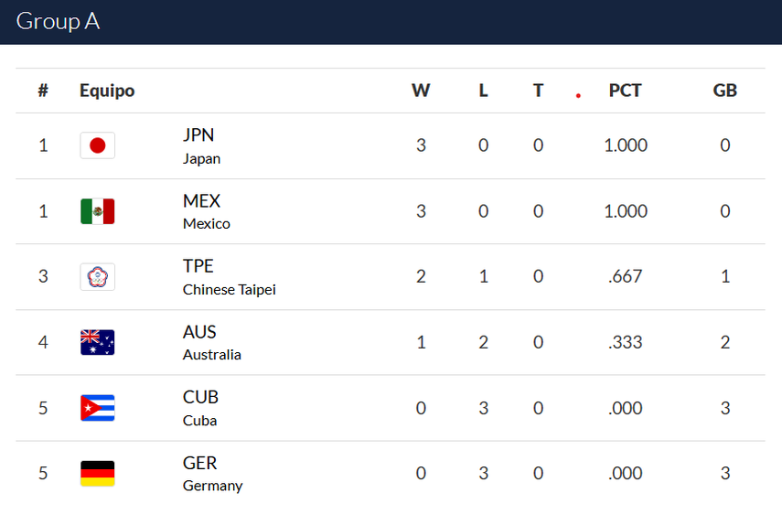 En el grupo A, Japón y México mantienen marca perfecta de 3-0, mientras que Taipéi quedó con registro de 2-1 en la tercera posición.