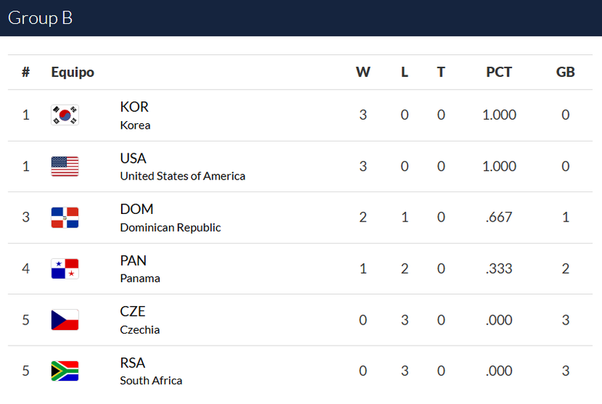 Estados Unidos y Corea del Sur siguen liderando la tabla de posiciones en el grupo B de la Copa Mundial de Béisbol U12, luego de tres jornadas en Tainán, sin embargo Panamá U12 (1-2) complicó su presencia en el certamen.