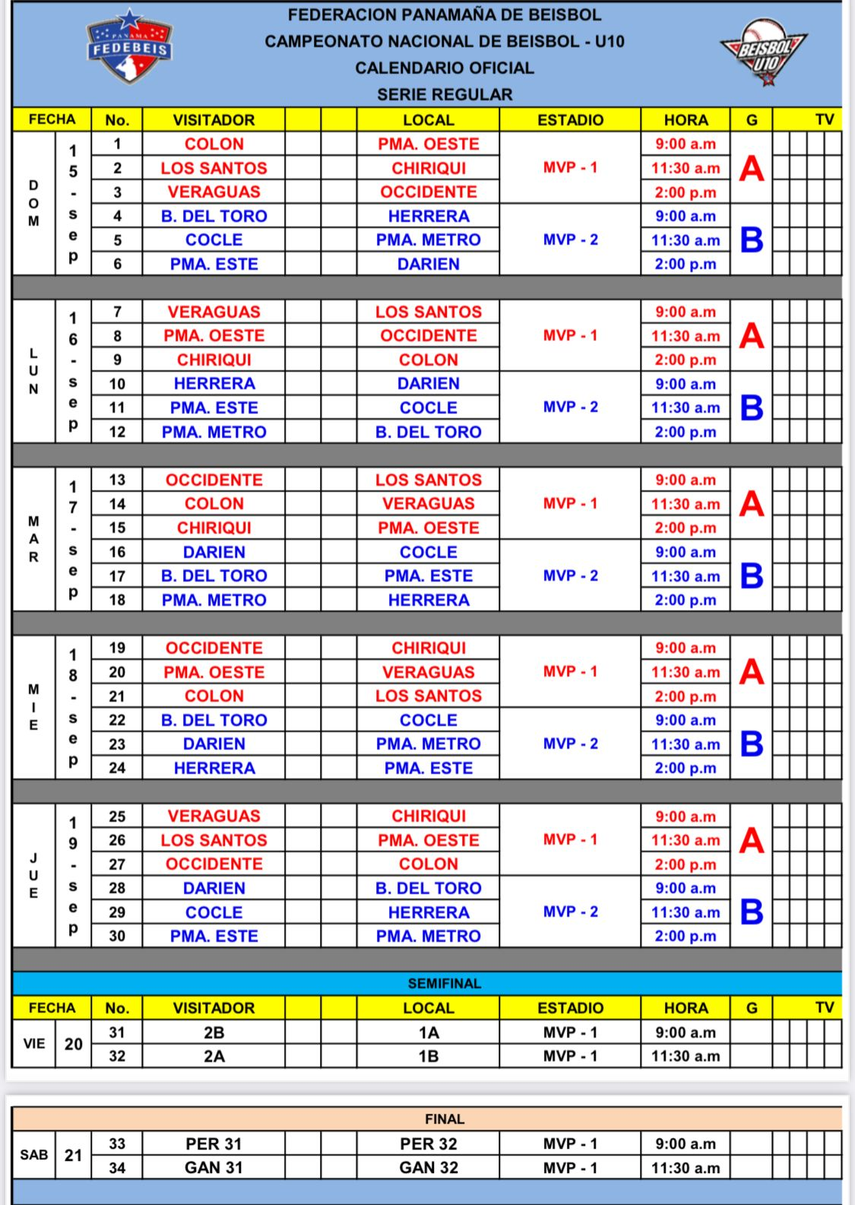 CALENDARIO DEL NACIONAL DE BÉISBOL U10