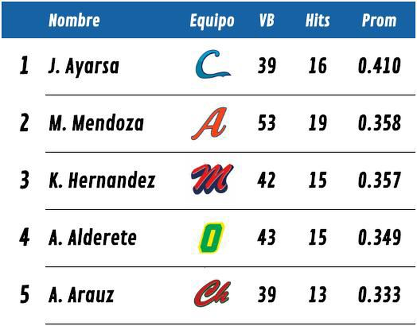 En el Top 5 de bateadores, siguen en el puesto tres, el metropolitano Keith Hernández con .357, Alfredo Alderete de Oeste es 4to con .349 y Andrés Araúz de Chiriquí es quinto con .333. En cuadrangulares el líder hasta el momento es Alan Meza de Metro con 2.