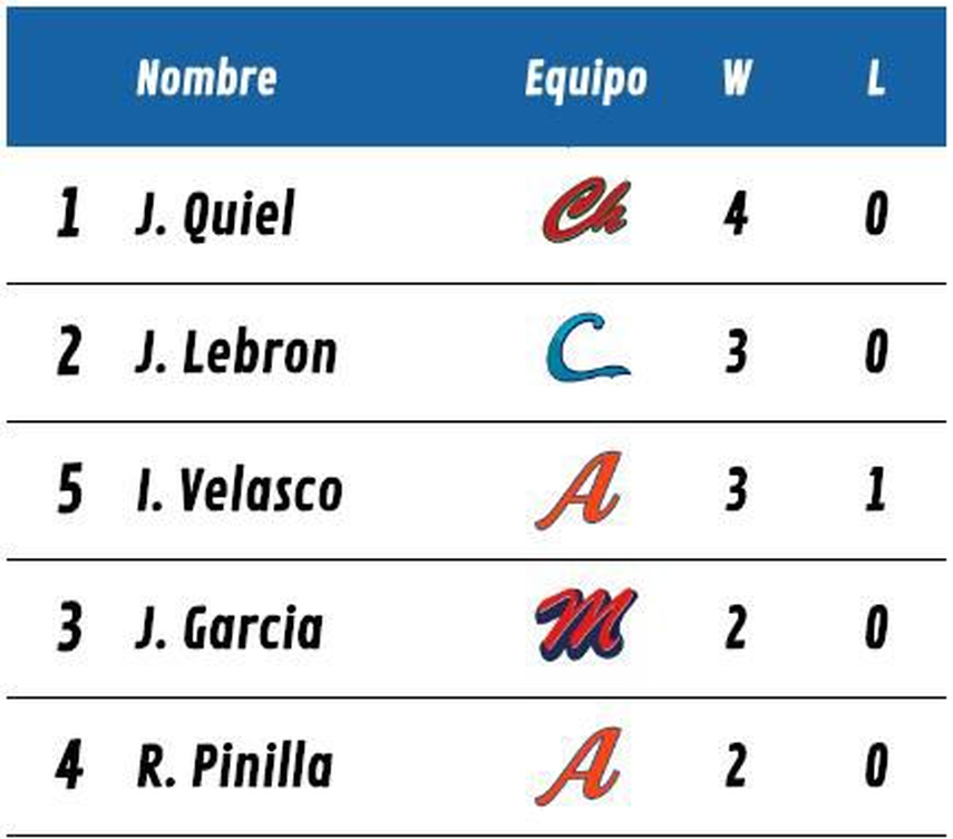 En el departamento de pitcheo, Jorge Quiel tiene marca de 4-0, seguido de José Lebrón de Colón con 3-0, Ismael Velasco de Azuero tiene 3-1, Jorge García de Metro 2-0 y Rance Pinilla de Azuero 2-0.