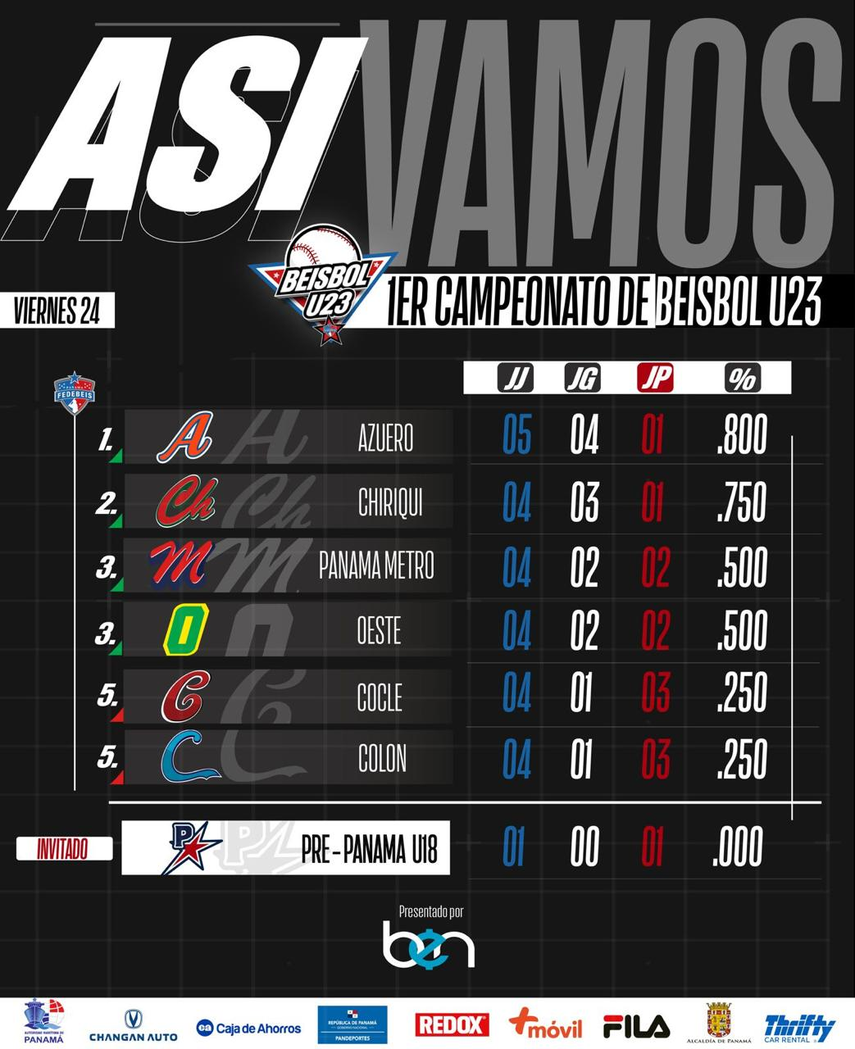 Azuero continúa como líder del Torneo Nacional de Béisbol U23 que se realiza los fines de semanas en todo el país, con 5 partidos disputados ha conseguido cuatro victorias y una sola derrota, ha estado líder durante las primeras jornadas.