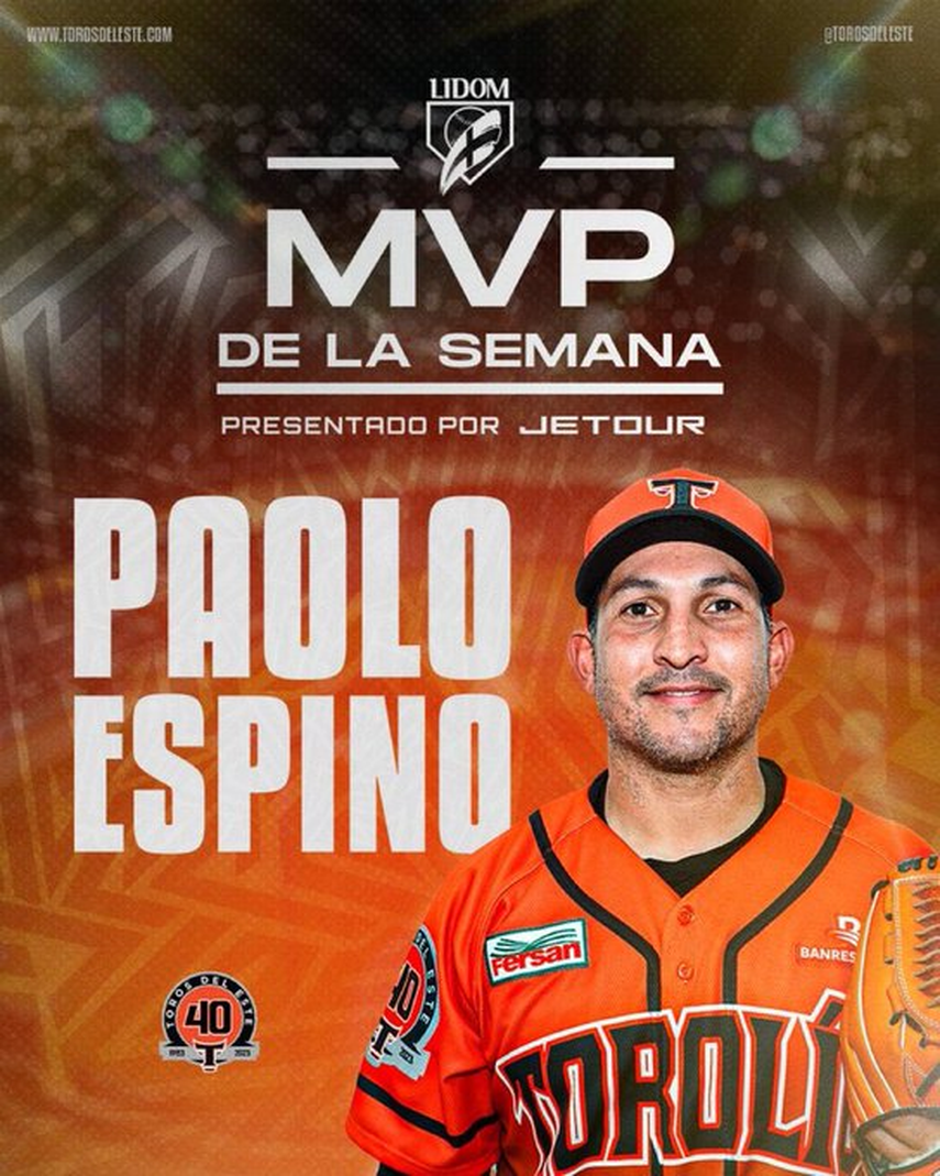 El lanzador panameño de los Toros del Este, Paolo Espino conquistó el MVP de la Semana en la Liga de Béisbol Profesional de la República Dominicana (LIDOM), recibiendo la mayoría de los votos de la crónica deportiva nacional, tanto vía internet, como presencial en esta quinta semana de la premiación.
