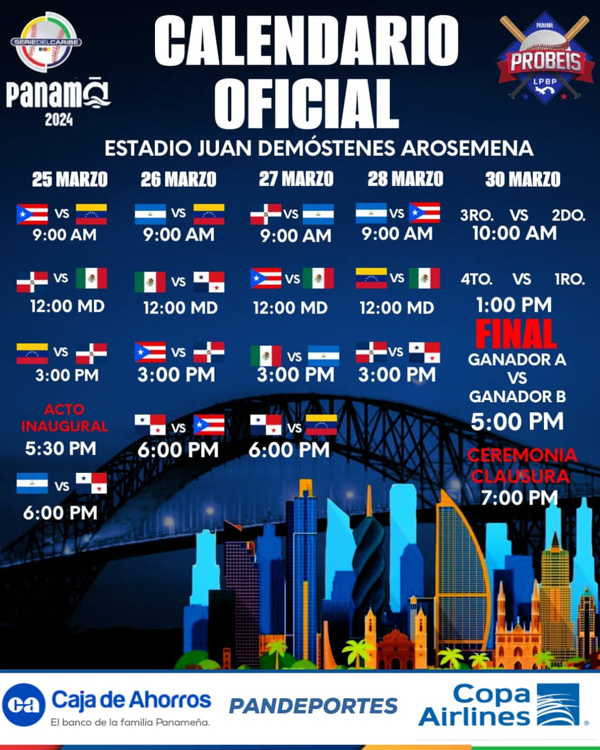 Panamá será representada por los Federales de Chiriquí que se convirtieron en los campeones del Probeis y clasificaron a la Serie del Caribe Kids 2024 que arranca este lunes 25 de marzo en el estadio Juan Demóstenes Arosemena, repasa el calendario de competencia tomando en cuenta que es formato todos vs todos.
