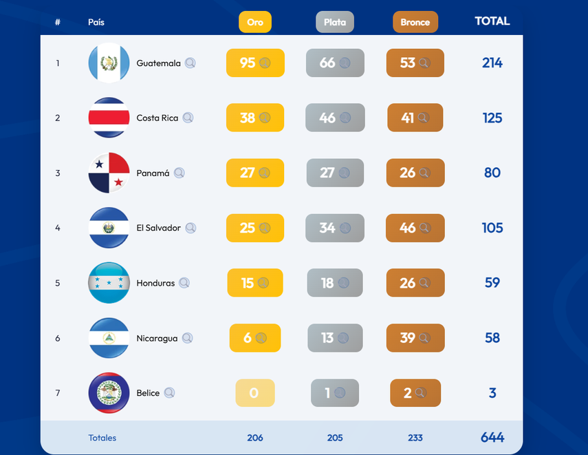 Guatemala, el país anfitrión del evento, ocupa la primera posición con 212 en total: 94 de oro, 65 de plata y 53 de bronce.