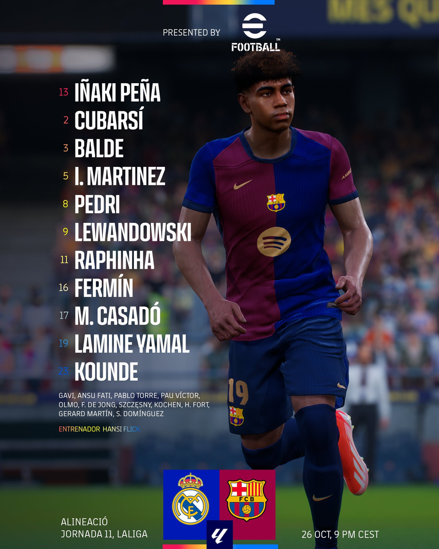 Iñaki Peña, Jules Koundé, Pau Cubarsí, Íñigo Martínez, Alejandro Baldé, Marc Casadó, Pedri, Lamine Yamal, Fermín López, Raphinha y Robert Lewandowski.