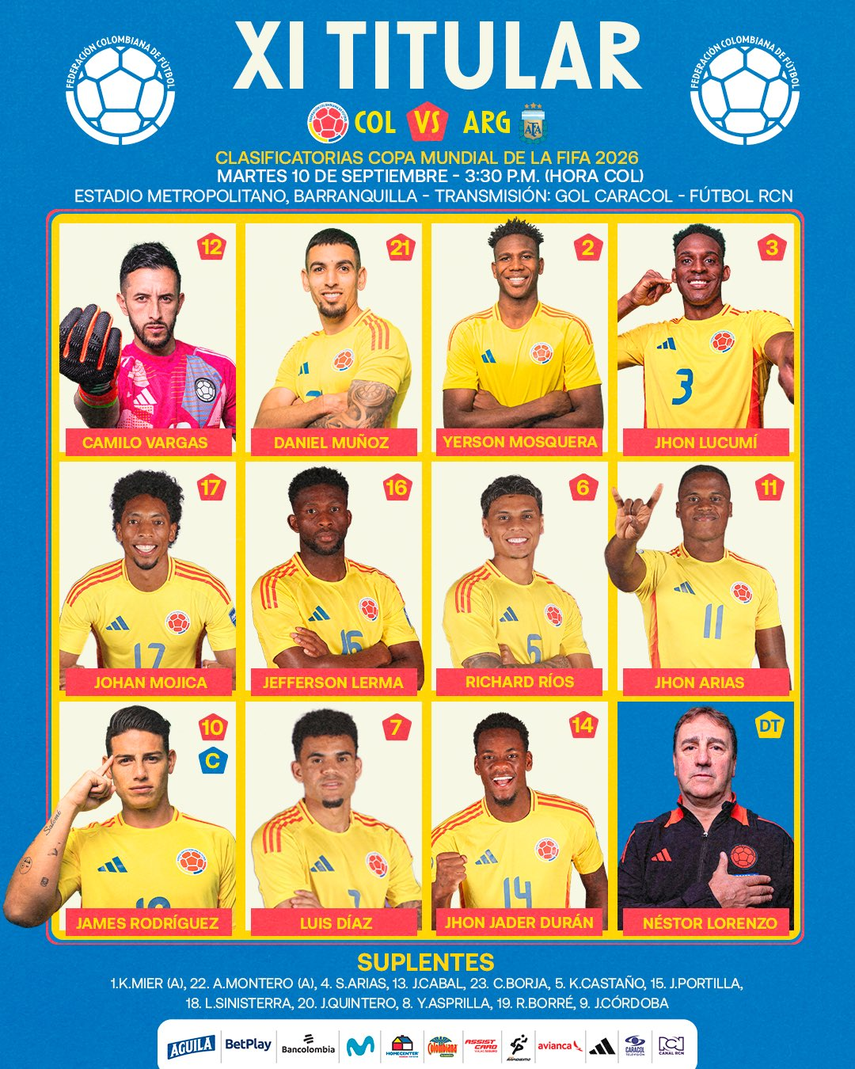 Camilo Vargas, Daniel Muñoz, Yerson Mosquera, Jhon Lucumí, Johan Mojica, Jefferson Lerma, Richard Ríos, Jhon Arias, James Rodríguez, Luis Díaz y Jhon Jader Durán.