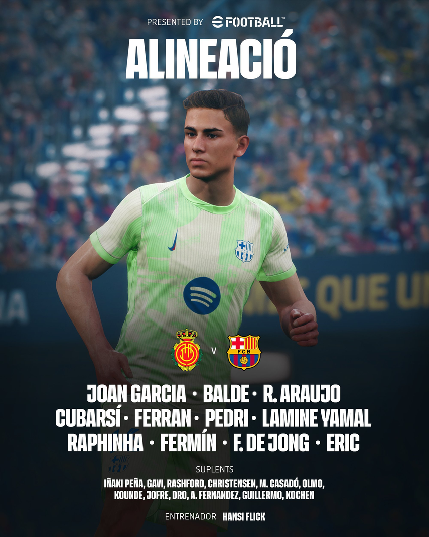 Joan García, Pau Cubarsí, Ronald Araújo, Eric García, Alejandro Baldé, Pedri, Frenkie de Jong, Lamine Yamal, Fermín López, Raphinha y Ferran Torres.