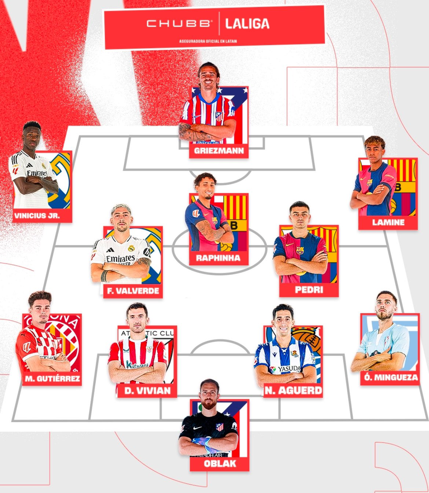LaLiga hizo estadísticas para la elección del mejor once ideal en lo que va de la temporada 2024-2025 y resaltan jugadores del FC Barcelona como Lamine Yamal y del Real Madrid como Vinicius Jr, otros del Atlético de Madrid, Athletic Club, Girona, entre otros.