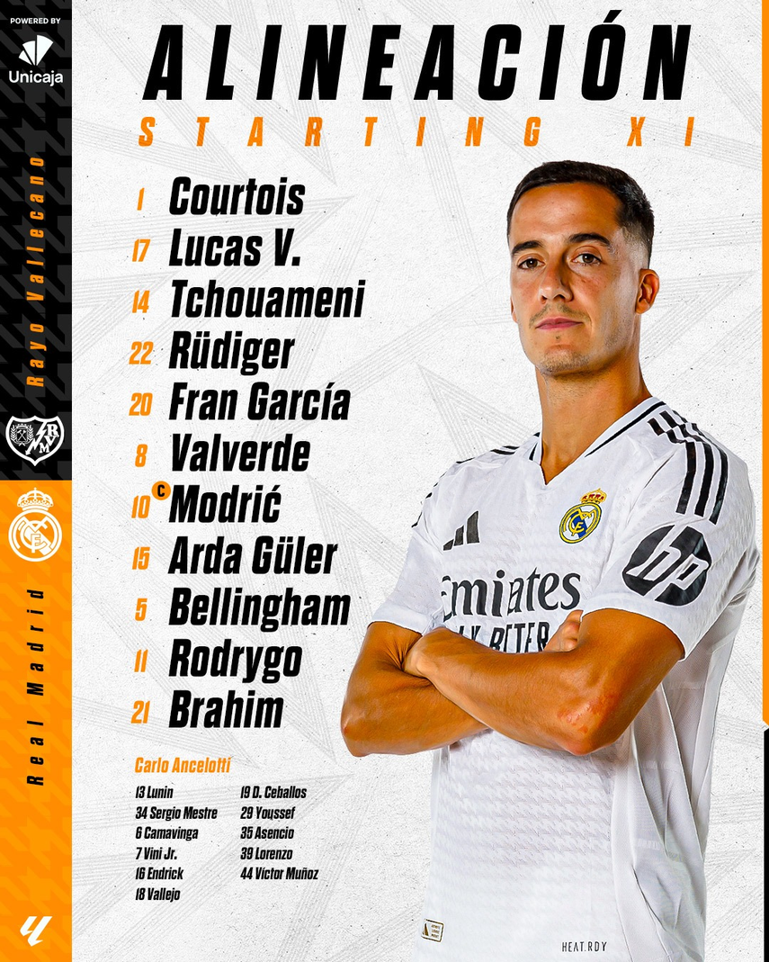 El Real Madrid de Carlo Ancelotti confirmó su alineación para visitar al Rayo Vallecano (3:00 pm) en el Estadio de Vallecas, en un choque correspondiente a la jornada 17 de LaLiga de España 2024-2025.
