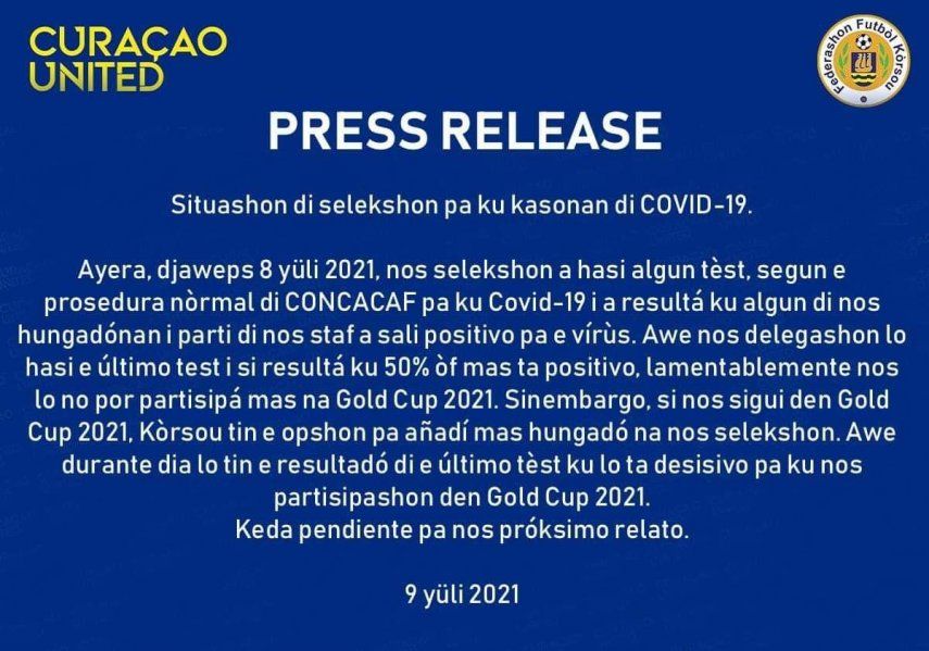 La Federación de Fútbol de Curazao emitió un comunicado señalando que tras las pruebas PCR realizadas el jueves 8 de julio como parte del protocolo de la Concacaf para la Copa Oro 2021, varios de sus jugadores y parte del staff resultaron positivos por COVID-19.