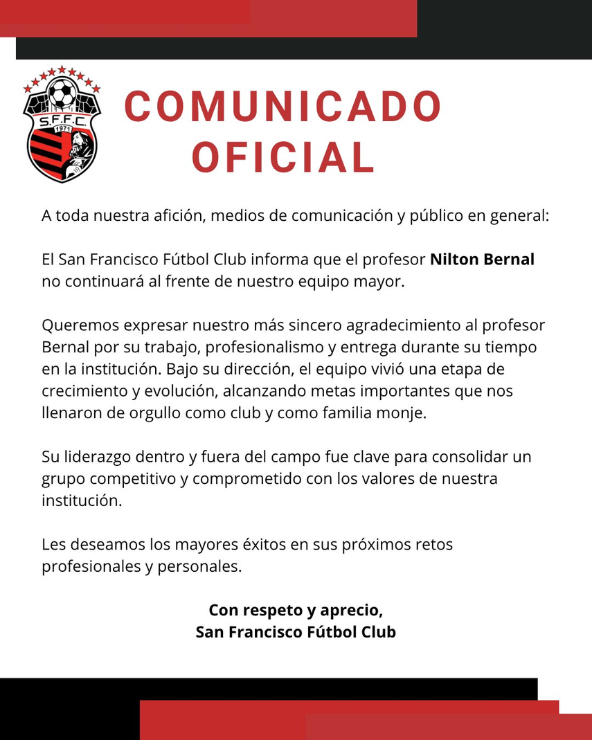 El San Francisco Fútbol Club informa que el profesor Nilton Bernal no continuará al frente de nuestro equipo mayor.