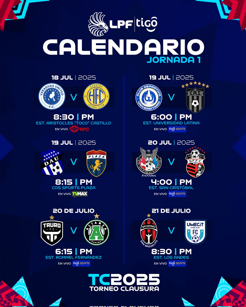 Las emociones del Torneo Clausura 2025 de la Liga Panameña de Fútbol (LPF TIGO) inician el viernes 18 de julio con el choque inaugural entre el Veraguas United y Herrera FC en el Estadio Aristocles "Toco" Castillo.