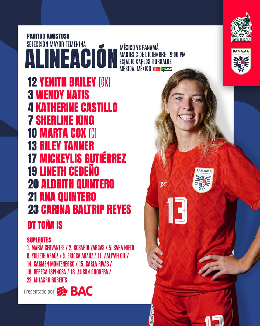 La entrenadora española Toña Is confirmó la alineación de la selección de Panamá Femenina para medirse a México en un amistoso internacional de alto voltaje a disputarse esta noche en el Estadio Carlos Iturralde.