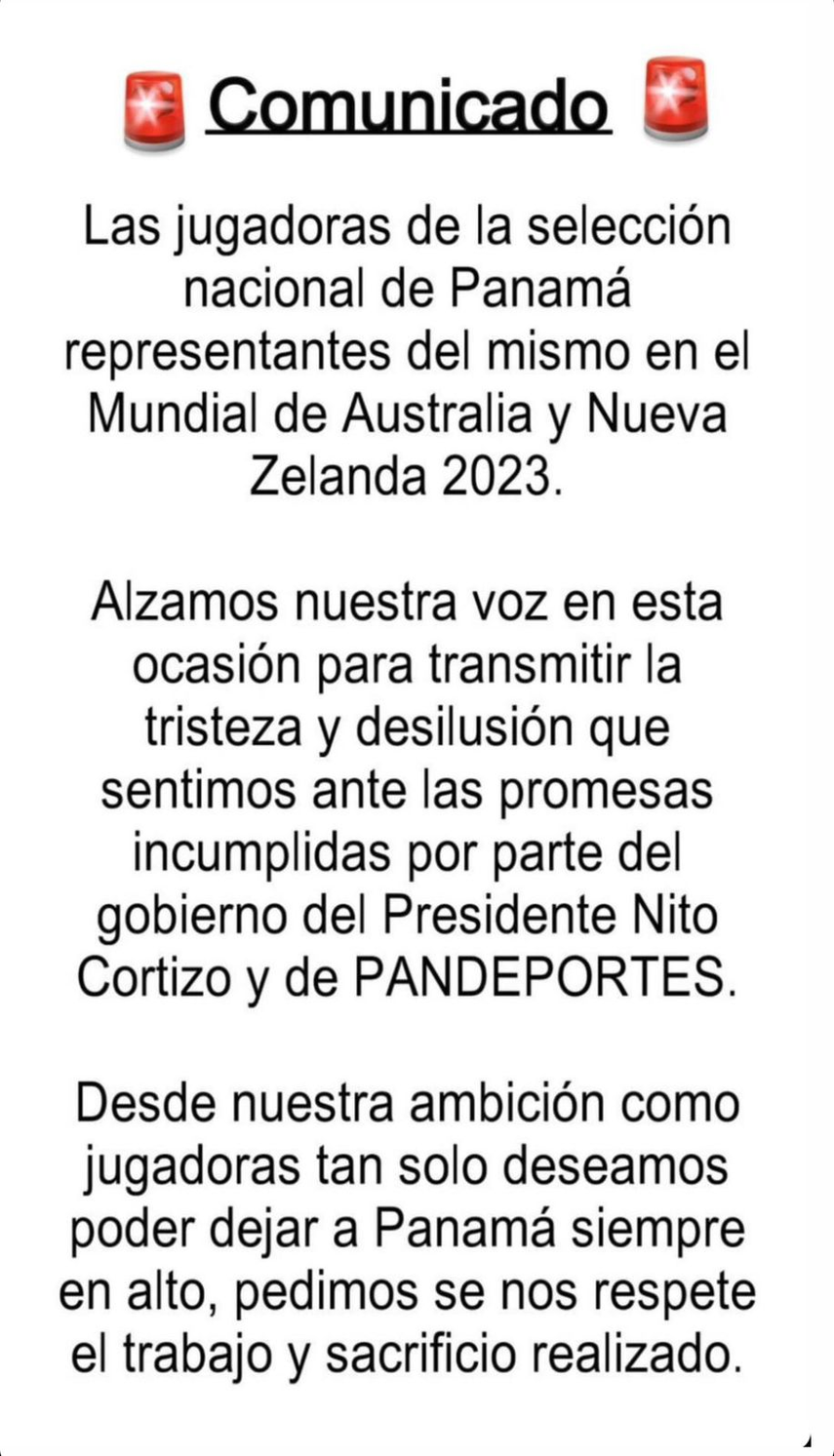 "Las jugadoras de la selección nacional de Panamá, representantes del mismo en el Mundial de Australia y Nueva Zelanda, alzamos nuestra voz en esta ocasión para transmitir la tristeza y desilusión que sentimos ante las promesas incumplidas por parte del gobierno del Presidente Nito Cortizo y de Pandeportes", iniciaba el comunicado.