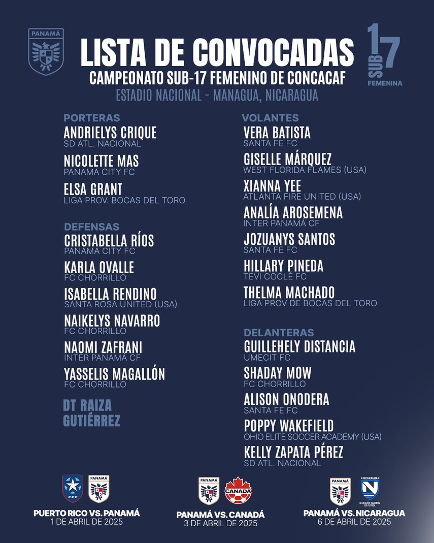 La Selección de Panamá Femenina Sub-17 ya conoce a las 21 convocadas por la DT, Raiza Gutiérrez, con las cuales se buscará clasificar a la Copa Mundial Femenina Sub-17 de la FIFA Marruecos 2025.