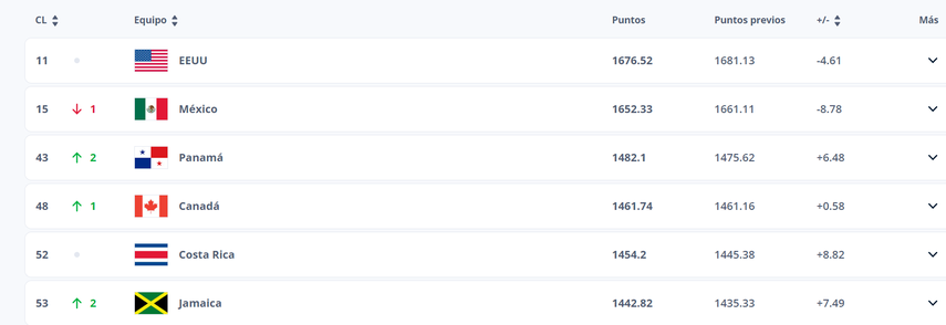 En La Confederación de Norteamérica, Centroamérica y el Caribe de Fútbol (CONCACAF), Panamá es tercero solo por detrás de Estados Unidos (1676.52) y México (1652.33).