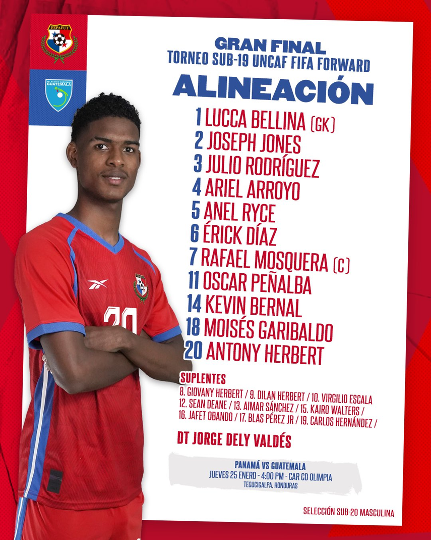 El onceno de Panamá Sub-20 definió su alineación para disputar la final del Torneo Sub-19 UNCAF ante Guatemala en el Centro de Alto Rendimiento del CD Olimpia de Honduras, este jueves 25 de enero desde las 4:00 p.m. por la señal de YouTube de UNCAF.
