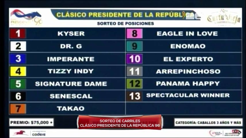 Este domingo 20 de julio se realizará el Clásico Presidente de la República en su versión número 96 en el Hipódromo Presidente Remón donde trece jinetes buscarán la bolsa de 75 mil dólares.