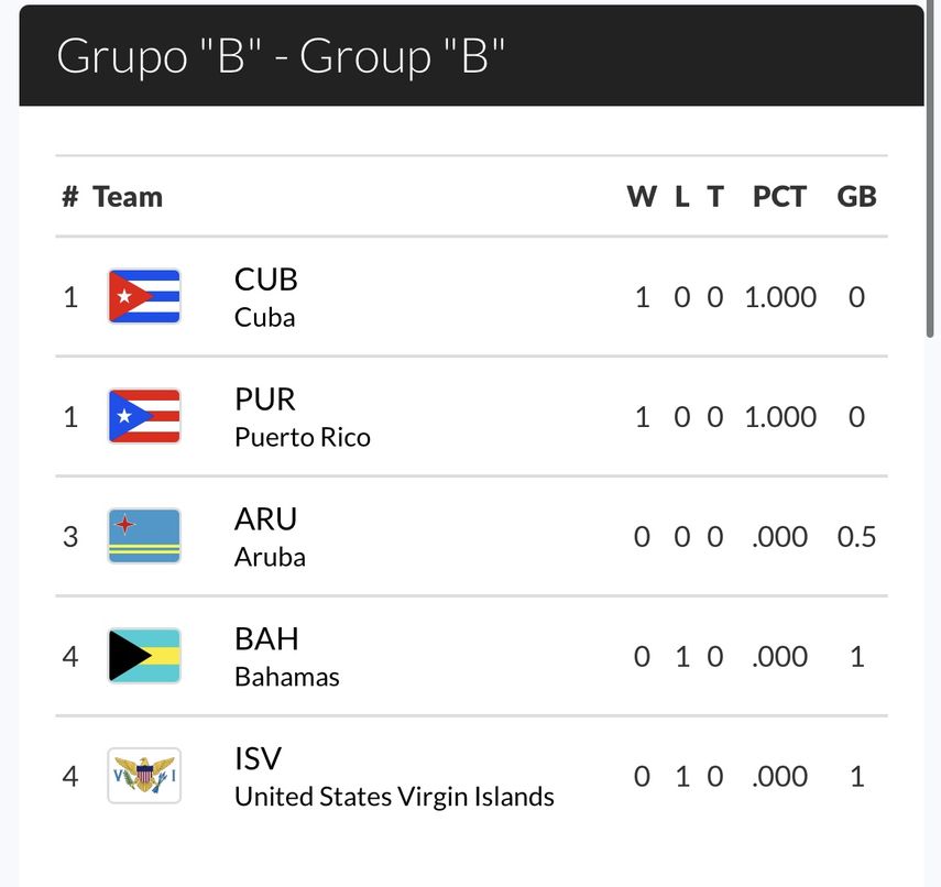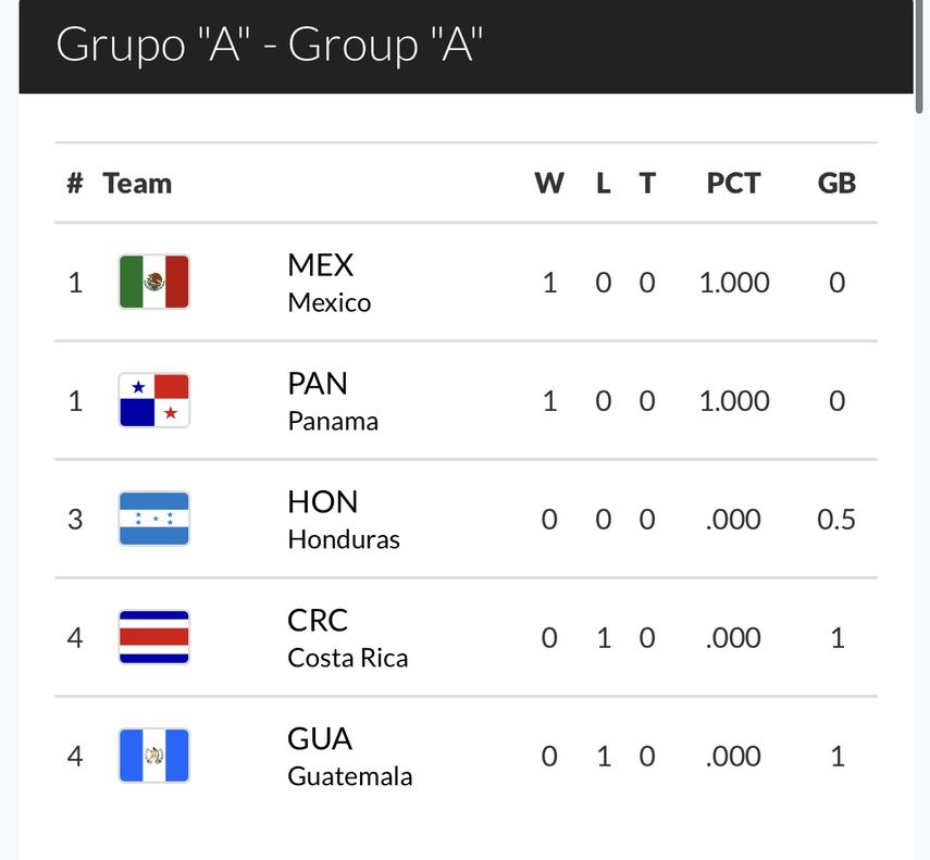 Tabla de posiciones tras la jornada 1 del Premundial de Béisbol U23