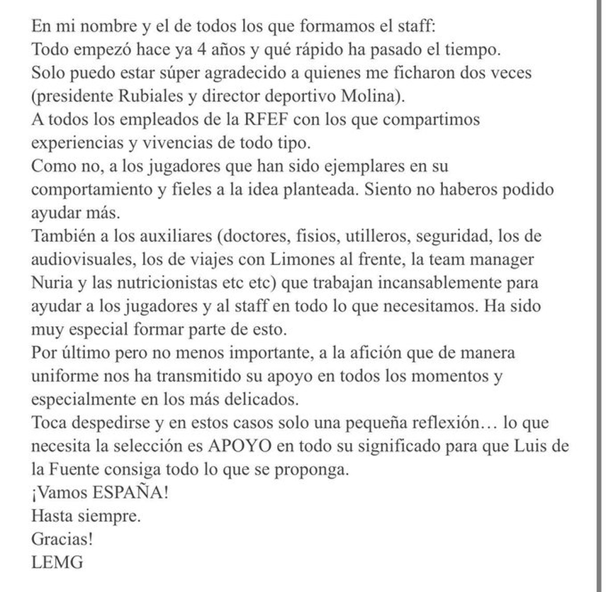 Agradecimiento y humildad, es lo que destaca del mensaje, nadie duda de la gran capacidad que posee el estratega, por lo que no sorprenderá verlo más pronto que tarde, detrás de algún banquillo alcanzando grandes cosas, pero por ahora no será más con la selección española.